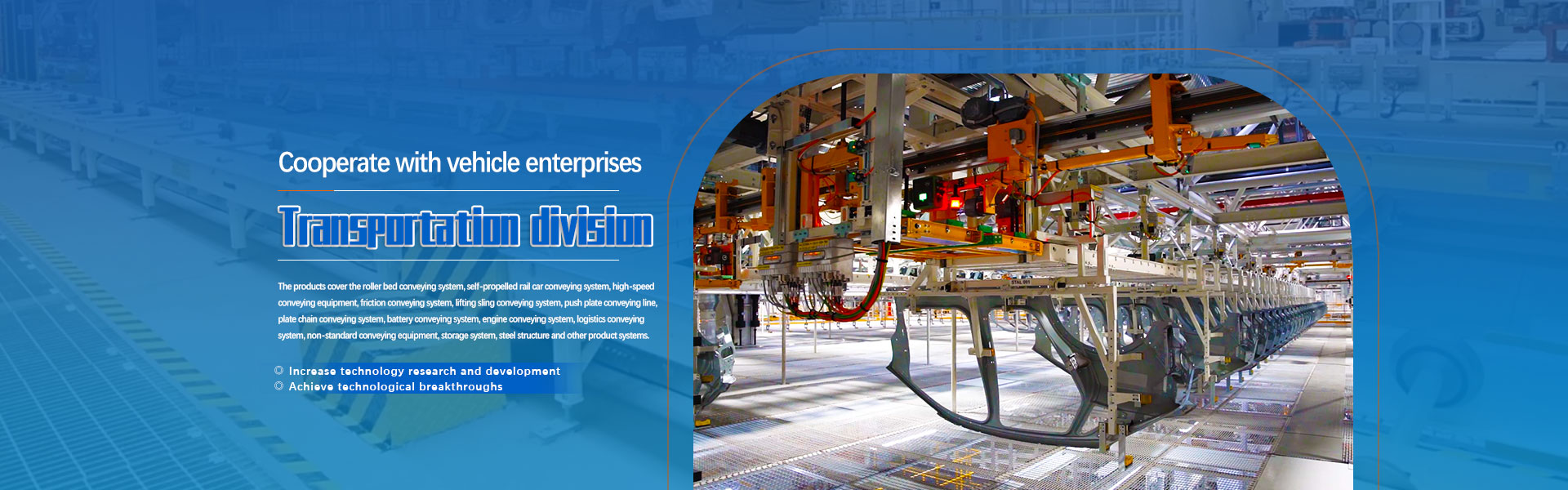 Becoming a leading technology and intelligent conveying equipment in the domestic independent research and development of high flexibility, high rhythm, high precision, and high stability, and mastering core technologies such as digital factories, robot simulation, and virtual debugging in the white body industry.