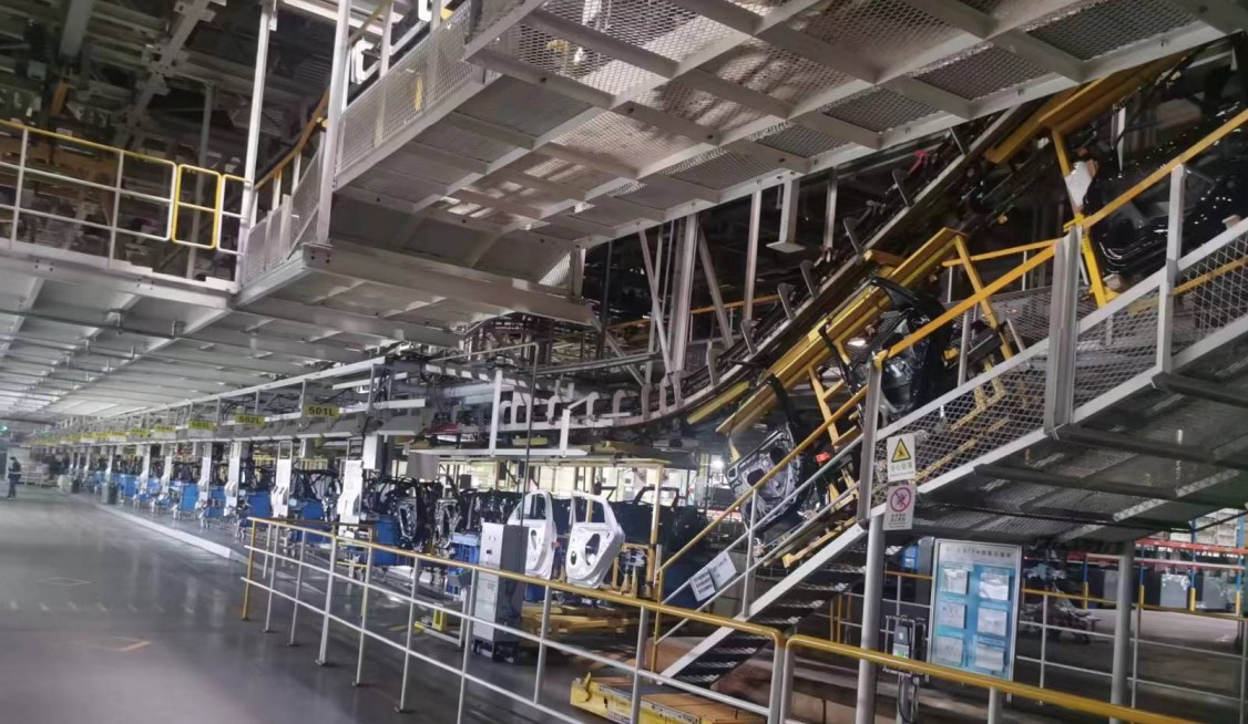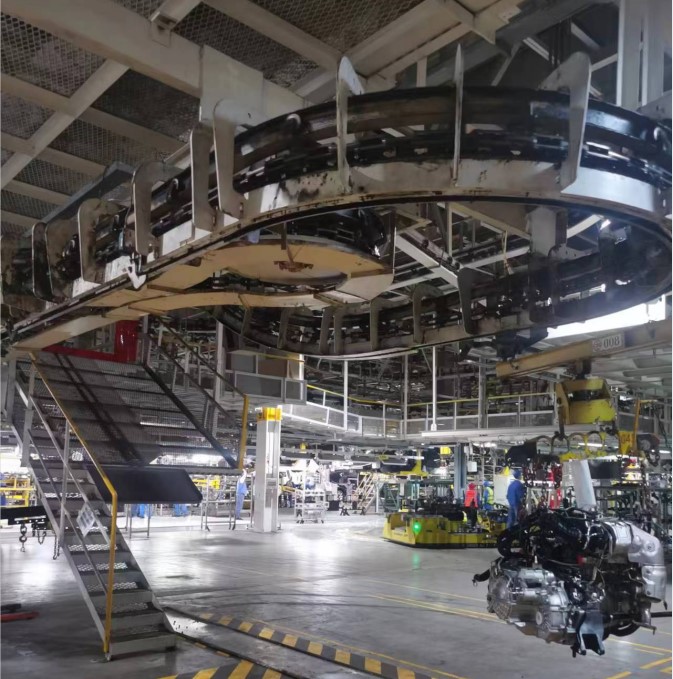 積放式輸送機(jī)在汽車制造業(yè)四門裝配線、發(fā)動機(jī)裝配線、整車裝配線等領(lǐng)域廣泛應(yīng)用。積放式懸掛輸送機(jī)的結(jié)構(gòu)積放式輸送機(jī)主要包括:輸送機(jī)軌道、牽引鏈條、積放小車組、驅(qū)動裝置、張緊裝置、停止器、滾子組回轉(zhuǎn)裝置、光輪回轉(zhuǎn)裝置、道岔、止退器、氣路控制裝置等,可根據(jù)需要設(shè)計成眾多布置形式、能方便實現(xiàn)區(qū)域性布線及快慢鏈傳遞。